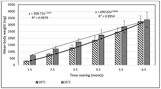 From day 7 of the rearing on, both mean body weights and mean body lengths of larvae kept in the water of 20 °C in temperature were statistically significantly different from those of the larvae maintained in the warmer water. From day 22 of the rearing, the differences in the mean body length between the individuals reared in the water of the temperature 20 °C and 26 °C remained basically on the same level, whereas differences in the body weight between these two groups increased exponentially. As soon as four weeks into the rearing, juvenile bitterlings kept in the warmer water resembled adult specimens in body shape. As the end of the first stage, bitterlings reared in the water of the temperature 26 °C reached the average body weight of 720.8 mg (±80.4) and the average body length of 40.2 mg (±2.1). Meanwhile, those kept in the warmer water, of the temperature of 20 °C, reached 298.5 mg (±32.2) of average weight and 34.4 mg (±1.67) of average length at the end of the rearing period. This meant they weighed nearly 2.5-fold less than their peers reared in the warmer water. Likewise, their rearing parameters, such as ITL, RGR, or the Fulton’s index, calculated on the basis of the measured body weights and lengths, were lower than the ones achieved for the bitterlings reared in the water of the temperature of 26 °C (Table 2). The increase in the total body length per unit of time (ITL) calculated for the bitterling fry from the water of the temperature of 20 °C and 26°C was 0.57 and 0.7 mm·d−1, respectively. The biomass of the fish reared in the warmer water at the end of the 1.5-month-long rearing period was 7.21 g·dm−3. Under the analysed thermal conditions, the RGR and RBR were higher for the fry maintained in the warmer water. During the second stage of rearing, which lasted for 150 days, the growth of bitterling fry in the water of the temperature of 26 °C was observed to gradually slow down. This was most probably caused by the fact that the fish achieved sexual maturity, which was manifested by the appearance of the mating robe. The growth of the bitterling fry in the colder water proceeded more rapidly, which is reflected by the computed values of rearing indices. At the end of the rearing period, bitterlings kept in the colder water decelerated their growth when reaching sexual maturity. Despite the initial differences in the body weight and length growth, no statistically significant differences were determined at the end of rearing between the fish originating from the two temperature regimes. At the end of the 6.5-month-long rearing period, the bitterlings from the water of the temperature of 20 °C reached the average body weight of 3242 mg (±427) at the average body length of 64.48 mm (±3.4). In the warmer water, they reached the average body weight of 3389 mg (±548) and the average body length of 66.2 mm (±3.0) (Figure 3 and Figure 4).