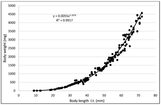 The values of the rearing indices calculated at the end of the rearing period were approximately the same for both water temperature regimes. At that time, the body length increase per unit of time (ITL) calculated for the bitterling fry kept in water at 20 °C and 26 °C was 0.20 and 0.17 mm·d−1, respectively. The biomass of fish reared in the warmer water at the end of an over six-month rearing period was 11.3 g·dm−3. The values of such indicators as the RGR and RBR were higher for the bitterling reared in the cooler water. Throughout the entire rearing period, no fish losses were recorded in either temperature regime, despite the fact that the fry were periodically subjected to manipulations when taking the measurements of their body weight and length. Based on the results of these measurements during the first and second stage of the rearing period, a curve was plotted illustrating the dependence between the length and the weight of the fry. This curve is shown in Figure 5.