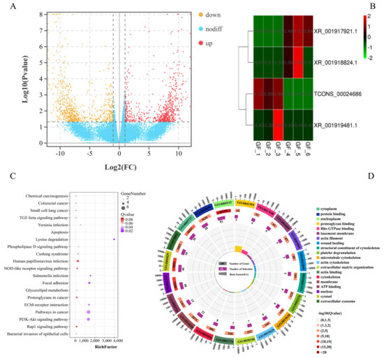 Functional analysis of DEmRNAs and DElncRNAs between the LFs and SFs of Dazu black goat: (A), volcano plot of 128 DEmRNAs; red represents up-regulated expression and orange represents down-regulated expression; (B), clustering heat map of 4 DElncRNAs; red represents up-regulated expression and green represents down-regulated expression; (C), top 20 pathways of KEGG enrichment analysis; and (D), top 20 terms of GO enrichment analysis.