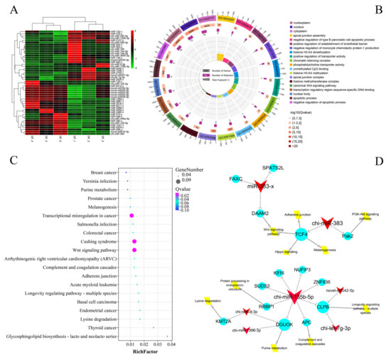 Functional analysis DEmiRNAs between LFs and SFs of Dazu black goats: (A), clustering heat map of 49 DEmiRNAs; red represents up-regulated expression and green represents down-regulated expression; (B), top 20 terms of GO enrichment analysis; (C), top 20 pathways of KEGG enrichment analysis; and (D), key miRNA regulation network in DEmiRNAs between LFs and SFs of Dazu black goats; red represents DEmiRNAs, blue represents DEmRNAs, and yellow represents the major pathways; the size represents the number of DEmiRNA-TGs, i.e., a larger size means greater number of DEmiRNA-TGs.