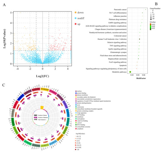 Functional analysis of DEcircRNAs between LFs and SFs of Dazu black goats: (A), volcano plot of 290 DEcircRNAs; red represents up-regulated expression and orange represents down-regulated expression; (B), top 20 pathways of KEGG enrichment analysis; and (C), top 20 terms of GO enrichment analysis.