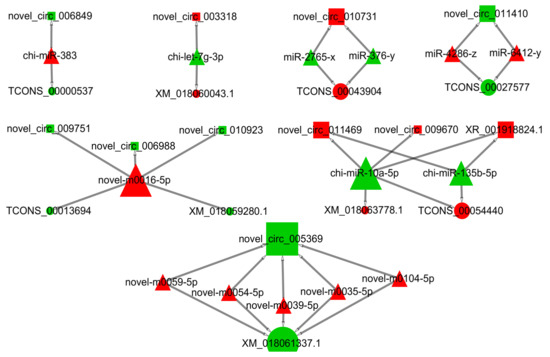 LncRNA/circRNA–miRNA–mRNA ceRNA network. Rectangles indicate lncRNA or circRNA, triangles represent miRNAs, and circles represent mRNAs. Red indicates up-regulation, and green indicates down-regulation.