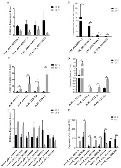 We randomly selected a total of 16 RNAs (mRNA, lncRNA, miRNA, and circRNA) to confirm the accuracy of the RNA-seq results in this study, which were significantly and DE in the RNA-seq results for RT-qPCR verification. Results showed that three mRNAs, one lncRNA, four miRNAs, and eight circRNAs were significantly and DE between the GF_T and GF_C groups by RNA-seq (B,D,F). However, only the relative expression levels (REL) of four miRNAs were significantly and DE by QPCR (Figure 5C; p < 0.05). The REL of other RNAs (mRNA, lncRNA, and circRNA) showed a consistent trend compared with the RNA-seq results (Figure 5A,E). Therefore, the sequencing and analysis results of the transcriptome were reliable.