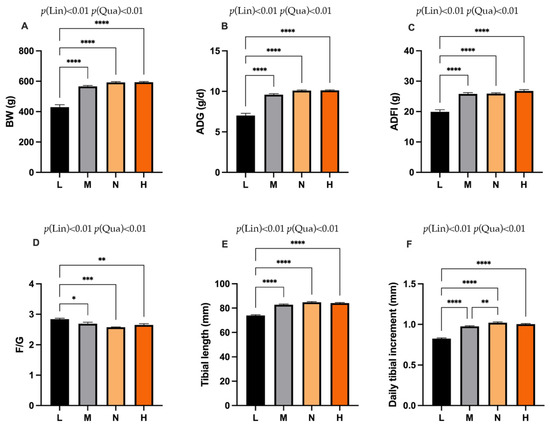 As shown in Figure 1, the results showed that the BW, ADFI, ADG, tibia length and daily tibial increment in the L group were significantly lower compared with other groups (p < 0.0001). However, the F/G in the L group was significantly higher than the M group (p < 0.05), N group (p < 0.001) and H group (p < 0.01). Moreover, the daily tibial increment in the M group was significantly reduced compared with the N group (p < 0.01).