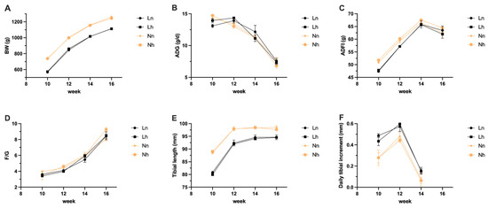 As shown in Figure 2, although the trend of ADG in Ln and Lh group at 12 weeks of age was shown to be higher than the two N groups, the standardized mean of BW in both L groups was still lower. No significant difference in ADFI and F/G among the four groups was found (p > 0.05). In addition, the daily tibial increment was higher in two L groups; however, the tibia length was still lower than the two N groups at 16 weeks of age. In addition, there was no significant interaction between the nPP levels of the brooding period and those of later periods (p > 0.05).
