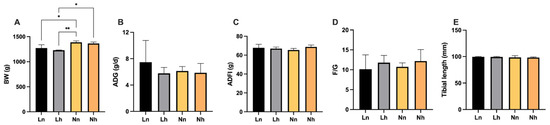 Effects of phosphorus restriction in brooding stage and subsequent recovery on growth performance of layers at 20 weeks of age. (A) BW (B) ADG (C) ADFI (D) F/G (E) Tibial length. BW = body weight, ADG = average daily gain; ADFI = average daily feed intake; F/G = the ratio of feed to gain. Data are shown as mean ± SEM. * p < 0.05, ** p < 0.01. Ln = group fed 0.13% nPP at 1–8 weeks and fed 0.39% nPP at 9–20 weeks; Lh = group fed 0.13% nPP at 1–8 weeks and fed 0.45% nPP at 9–20 weeks; Nn = group fed 0.45% nPP at 1–8 weeks and fed 0.39% nPP at 9–20 weeks; Nh = group fed 0.45% nPP at 1–8 weeks and fed 0.45% nPP at 9–20 weeks. n = 6 per group.