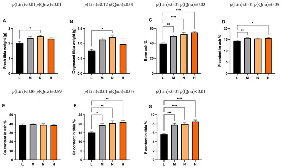 Effects of phosphorus restriction in brooding stage on tibia characters of layers at 6 weeks of age. (A) Fresh tibia weight (B) Decreased tibia weight (C) Bone ash (D) P content in ash (E) Ca content in ash (F) Ca content in tibia (G) P content in tibia. Data are shown as mean ± SEM. * p < 0.05, ** p < 0.01, *** p < 0.001, **** p < 0.0001, p (Lin) = p-value (linear effect), p (Qua) = p-value (quadratic effect). L = group fed 0.13% nPP; M = group contained 0.29% nPP; N = group contained 0.45% nPP; H = group contained 0.59% nPP. n = 6 per group.