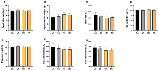 Effects of phosphorus restriction in brooding stage and subsequent recovery on tibia characters of layers at 20 weeks of age. (A) Fresh tibia weight (B) Decreased tibia weight (C) Bone ash (D) P content in ash (E) Ca content in ash (F) Ca content in tibia (G) P content in tibia. Data are shown as mean ± SEM. Ln = group fed 0.13% nPP at 1–8 weeks and fed 0.39% nPP at 9–20 weeks; Lh = group fed 0.13% nPP at 1–8 weeks and fed 0.45% nPP at 9–20 weeks; Nn = group fed 0.45% nPP at 1–8 weeks and fed 0.39% nPP at 9–20 weeks; Nh = group fed 0.45% nPP at 1–8 weeks and fed 0.45% nPP at 9–20 weeks. n = 6 per group.
