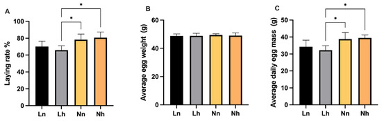 Effects of phosphorus restriction in brooding stage and subsequent recovery on laying performance of layers at 26 weeks of age. (A) Laying rate (B) Average egg weight (C) Average daily egg mass. Data are shown as mean ± SEM. * p < 0.05. Ln = group fed 0.13% nPP at 1–8 weeks and fed 0.39% nPP at 9–20 weeks; Lh = group fed 0.13% nPP at 1–8 weeks and fed 0.45% nPP at 9–20 weeks; Nn = group fed 0.45% nPP at 1–8 weeks and fed 0.39% nPP at 9–20 weeks; Nh = group fed 0.45% nPP at 1–8 weeks and fed 0.45% nPP at 9–20 weeks. n = 6 per group.