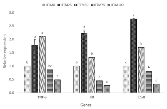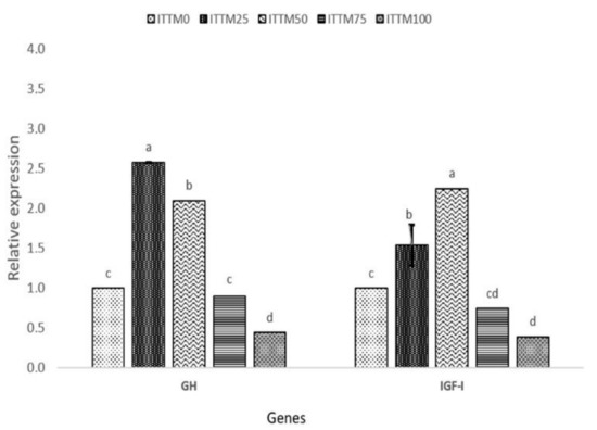 The fish fed with ITTM25 and ITTM50 diets showed a significantly higher expression of GH, IGF-I, TNF-α, IL-8 and IL-1β in the muscle and liver tissue compared to the other experimental groups (p < 0.05). Significant down-regulation was shown in fish fed with ITTM75 and ITTM100 diets (p < 0.05).