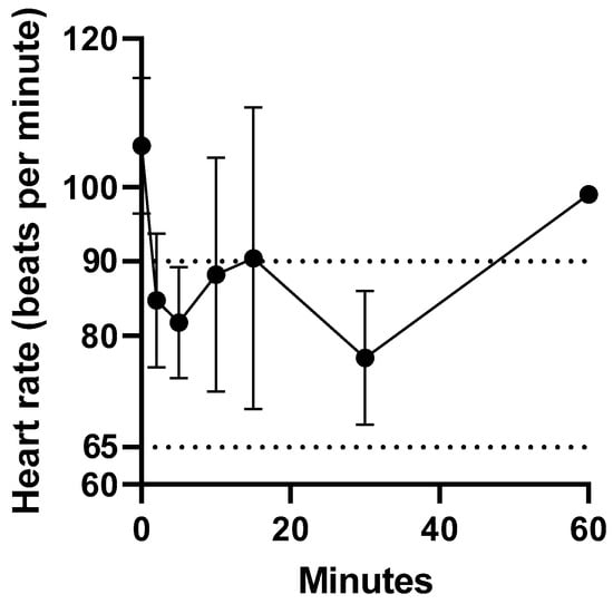 Mean ± S.D heart rate on administration of fentanyl 5 µg/kg as a single i.v. bolus over the first hour. Normal koala heart rate (bpm) is within dotted lines. There was only a significant difference in mean heart rate between 0 and 2 min (p = 0.04).