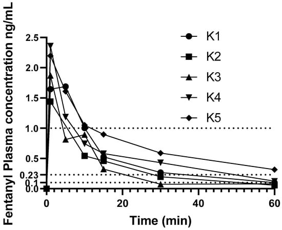- Sano, T.; Nishimura, R.; Kanazawa, H.; Igarashi, E.; Nagata, Y.; Mochizuki, M.; Sasaki, N. Pharmacokinetics of fentanyl after single intravenous injection and constant rate infusion in dogs. Vet. Anaesth. Analg. 2006, 33, 266–273. [Google Scholar] [CrossRef] [PubMed]