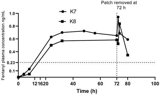 The change in plasma fentanyl concentrations over time on application and removal of the patch are shown in Figure 3. After application of the TFP, plasma fentanyl concentration was first detected at 4 h in one koala and 8 h in the other. Mean Cmax of 0.89 ng/mL (range 0.84–0.94 ng/mL) was detected at 73 to 74 h.