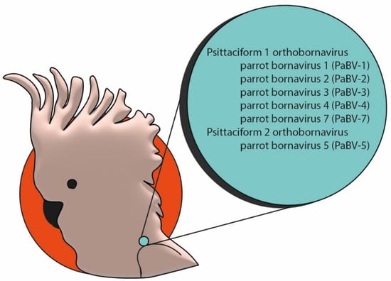 - Piepenbring, A.K.; Enderlein, D.; Herzog, S.; Al-Ibadi, B.; Heffels-Redmann, U.; Heckmann, J.; Lange-Herbst, H.; Herden, C.; Lierz, M. Parrot Bornavirus (PaBV)-2 isolate causes different disease patterns in cockatiels than PaBV-4. Avian Pathol. 2016, 45, 156–168. [Google Scholar] [CrossRef]