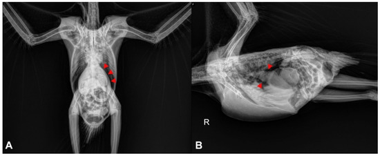 Radiographic projections of a young macaw with PDD. (A) Ventrodorsal projection. Moderate dilatation of the proventriculus (arrowheads). The proventriculus extends beyond the liver edge. (B) Lateral projection. The proventriculus (arrowheads) is moderately distended and contains ingesta and gas. R = Right side.