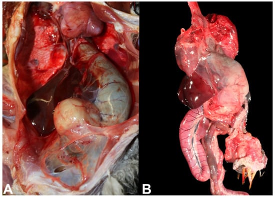 Macroscopic lesions of PDD in psittacine birds. (A) Thin-walled distended proventriculus in the coelomic cavity of a red-and-green macaw hybrid (Ara chloropterus). (B) Ex situ thin-walled distended proventriculus of a Catalina macaw.