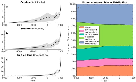 To reconstruct climate-specific natural vegetation through time, we first generated global maps of monthly temperature, precipitation, and cloud cover between 6000 BCE and 1850 CE based on 3.75° × 2.5° resolution simulations of the HadCM3 climate model [17], available as climatological normals (i.e., 30-year averages) in 1000-year intervals between 6000 BCE and 1000 CE (available from: https://www.paleo.bristol.ac.uk/, last accessed on 9 December 2021), and annually for the last 1000 years (available from: https://esgf-node.llnl.gov/search/cmip5/, last accessed on 9 December 2021). Based on the latter, annual data, we generated climatological normals in 50-year intervals for the last 1000 years. The complete time series of monthly temperature, precipitation, and cloud cover normals since 6000 BCE was then bias-corrected and downscaled to a 0.5° resolution using the delta method [18] and observation-based climate maps of the 1900–1930 period [19]. Finally, the monthly climatological normals, along with reconstructions of global mean atmospheric CO2 concentration [20,21], were used as inputs for the Biome4 vegetation model [22], allowing us to reconstruct global biome distributions in 1000-year intervals between 6000 BCE and 0 CE, 100-year intervals between 0 and 1700 CE, and 30-year intervals between 1700 and 1850 CE. The available data did not allow us to estimate uncertainty bounds of the climate data, and by extension, the vegetation maps. Figure 1d summarises the simulated global distribution of megabiomes through time.