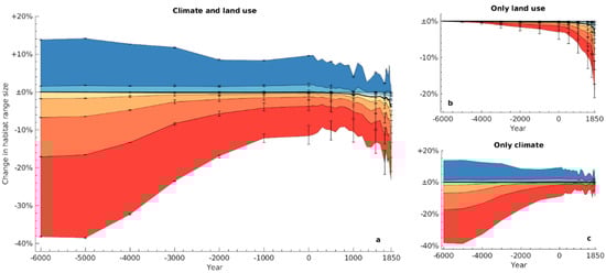 Estimated changes in range sizes between 6000 BCE and 1850 CE, relative to potential natural ranges in 1850. Coloured areas represent 10th, 20th, …, 90th percentiles (red, orange, …, blue) of range changes across the 16,919 species; the black line shows the across-species median. Panel (a) represents the default scenario accounting for both land use and climatic changes through time, whereas (b) is based on a constant global distribution of natural vegetation corresponding to climatic conditions in 1850, and (c) considers only the effects of climate through time, while assuming no anthropogenic land use. Upper and lower uncertainty bars in (a,b) correspond to the same analyses run based on the available upper and lower uncertainty bounds of the land use reconstructions.
