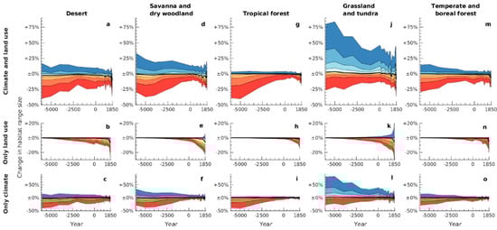 Estimated changes in range sizes over time, relative to potential natural ranges in 1850, depending on species’ primary megabiome. The top (a,d,g,j,m), middle (b,e,h,k,n), and bottom (c,f,i,l,o) panels in each column are analogous to Figure 2a–c, respectively, but represent only species with the relevant primary megabiome.