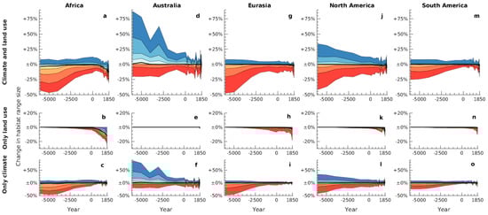 Similarly, estimated range changes were not homogenous across global geographical areas. For five major regions (Africa, Australia, Eurasia, North and South America), we considered separately the range dynamics of species according to their primary geographical region, defined as the area that most of their potential natural range in 1850 CE overlapped with (Figure 4). We found, in particular, a relatively higher proportion of species whose ranges decreased in area towards the present in Australia, and somewhat less in North America, as the result of climatic changes (Figure 4d,f,j,l). Our analysis also highlight the effects of different land use histories in these regions on species’ ranges, specifically the comparatively later and less extensive conversion of natural habitat in Australia and South America, compared to other parts of the world (Figure 4b,e,h,k,n).