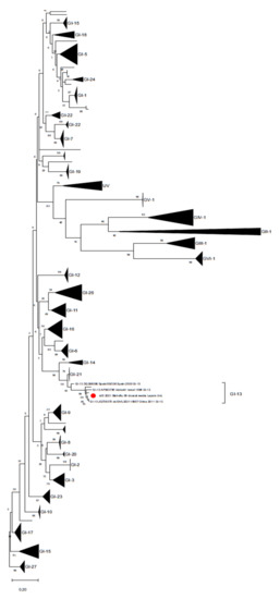 Phylogenetic tree reconstructed for IBV strain characterization with the database proposed by Valastro et al., (2016) [33]. The phylogenetic tree was reconstructed using the Maximum Likelihood method and General Time Reversible model with discrete Gamma distribution. Branch support is shown next to the branches. The Ethiopian strain is marked with a red circle, sequences belonging to the different lineages have been collapsed and single branches represent unique variants.