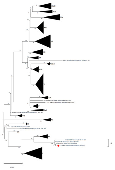Phylogenetic tree reconstructed for NDV strain characterization with the database proposed by Dimitrov et al., (2019) [35]. The phylogenetic tree was reconstructed using the Maximum Likelihood method and Kimura 2-parameter model with discrete Gamma distribution. Branch support is shown next to the branches. The Ethiopian strain is marked with a red circle.