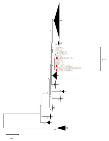 All cloacal swabs from the layer farms tested negative for IBDV, whereas 3 out of 8 bursa imprint pools from the broiler farm (1/16 farms, 6.25%) were positive for IBDV, resulting in highly similar sequences (99.8–100% identity) to the Winterfield-2512 vaccine strain (reference strain MH329181.1), belonging to the classical/virulent genogroup A1a [34] (Figure 3). According to the declared vaccination strategy of the farm, this strain was used for the bird immunizations.