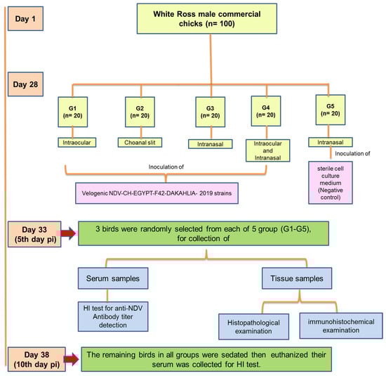 - Mousa, M.; Mohammed, F.; Khalefah, H.; El-Deeb, A.; Ahmed, K. Comparative serological, histopathological and immunohistochemical evaluation of immune status of broiler chickens experimentally infected with velogenic Newcastle disease virus in different ages. Int. J. Vet. Sci. 2019, 8, 143–150. [Google Scholar]