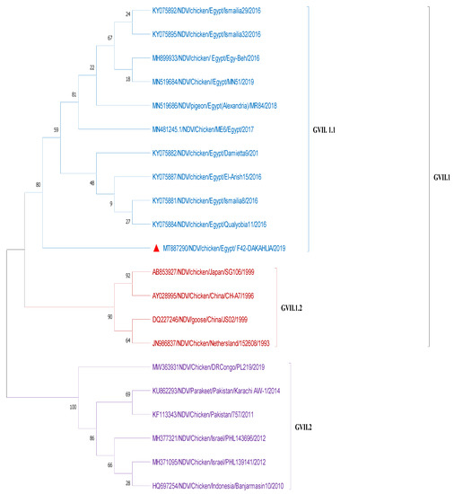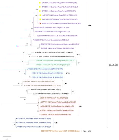 - Selim, K.M.; Selim, A.; Arafa, A.; Hussein, H.A.; Elsanousi, A.A. Molecular characterization of full fusion protein (F) of Newcastle disease virus genotype VIId isolated from Egypt during 2012–2016. Vet. World 2018, 11, 930–938. [Google Scholar] [CrossRef] [PubMed]