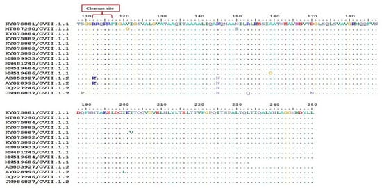 - Tirumurugaan, K.G.; Vinupriya, M.K.; Vijayarani, K.; Kumanan, K. Analysis of the Fusion Protein Cleavage Site of Newcastle disease virus Isolates from India Reveals Preliminary Evidence for the Existence of II, VI and VII Genotypes. Indian J. Virol. 2011, 22, 131–137. [Google Scholar] [CrossRef][Green Version]