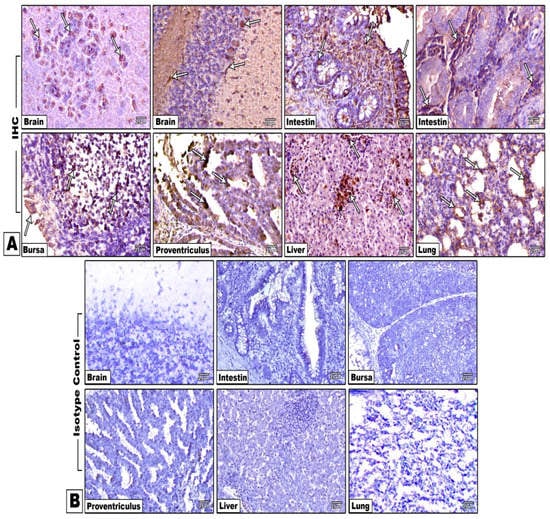 - Adriano, D.O.T.C.; Meire, C.S.; Tiago, W.P.M.; Jayme, A.P.; Laura, M.K.; Mario, H.A.; Jyan, L.B.; Priscila, I.; Aramis, A.P.; Carrasco, A.D.O.T.; et al. Use of immunohistochemistry (IHC) in the detection of Newcastle disease virus (NDV) in experimentally and naturally infected birds. Afr. J. Microbiol. Res. 2015, 9, 2225–2231. [Google Scholar] [CrossRef][Green Version]
