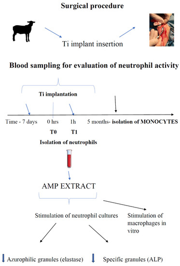 Titanium is a generally accepted biomaterial as a relatively inert substance with minimal side effects, and it is used in many medical fields among other in orthopedics implants. However, with the increased application of Ti, the concerns over the safety of this biomaterial also increases. Some recent studies suggest that, under some circumstances, the presence of Ti particles may be harmful, especially following frictional wear of medical prostheses or of screws used in plate fixation during orthopedic procedures. The particles and ions released from Ti implant can be deposited in surrounding tissues causing inflammatory reactions, hypersensitivity, and/or can lead to toxic reactions [15]. Thus, there is a need for interest about Ti safety and potential dangers [15,16]. For these reasons we decided to investigate the role of two neutrophil-derived products as potential modifiers of the white blood cells (WBC) system response during implantation of biomaterial. The results from the study conducted by Frisken et al. indicate that sheep is an excellent model for following the biological changes associated with successful or failed insertion of Ti implants [16]. Sheep are also widely accepted as a large animal model for translating potential musculoskeletal injury and repair therapies [17,18]. Therefore, we decided to use this model for Ti implant insertion into the tibia and to evaluate two ovine neutrophil products: antimicrobial neutrophil extract (ANE) and neutrophil degranulation products (DGP) for potential enhancement of healing. Ovine neutrophil extract is composed of some cathelicidins, namely, SMAP-29, SMAP34, OaBac5, OaBac6, 5 Oabac7.5, and OaBac11 [19]. It has been previously considered as an alternative for antibiotics [20,21], whereas bovine DGP was previously evaluated by Hussen et al. [21] as a potential stimulator of monocytes and monocyte–macrophage differentiation. To broaden the knowledge about biomaterial–host interactions on the basis of WBC response, we evaluated the immediate and long-term leukocyte response to Ti implant insertion in this animal model. In light of the fact that excessive (WBC) response may cause disturbances in the healing processes, up to implant rejection, our first aim was to assess neutrophil and monocyte-derived macrophages (MDM) activity during insertion of Ti implants into the proximal tibial physis in a sheep model. In this study, the overall responses involved in surgical procedures, implant insertion, and postoperative treatment were taken into account. For the assessment of systemic immune response, plasma concentration of acute phase proteins (APP) was measured at appropriate time points. Neutrophil activity was evaluated during the inflammatory phase of the healing process, whereas MDM assessment was conducted during the long-term immune recognition of implants. Our second aim was to evaluate two neutrophil-derived autologous products i.e., ANE and DGP, as potential modifiers of leukocyte response during Ti implant insertion. The obtained results have the potential for application in the regulation of inflammatory response during the repair process and to decrease excessive inflammation.
