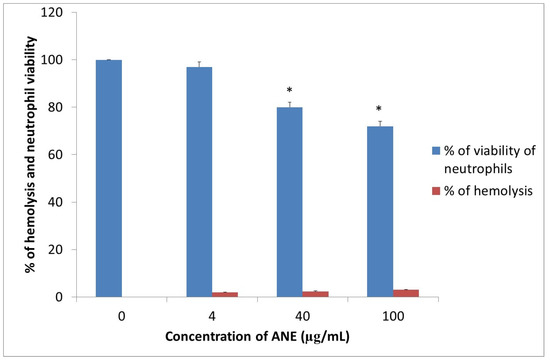 Test of potential cytotoxic and hemolytic ANE activity against host cells (neutrophils and erythrocytes, respectively). ANE was used at concentrations of 4, 40, and 100 µg/mL. Dose-dependent reduction in viability and increased hemolysis were observed (* p < 0.05 compared to 0 µg/mL).