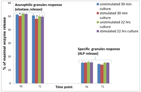 The differences in activity of neutrophils isolated before and after implantation of biomaterial were insignificant. On the other hand, changes were noted after the treatment of the cultures with ANE. In neutrophil cultures obtained after implantation of biomaterial (T1), the stimulation with ANE for 30 min caused significant (p < 0.05) decrease of elastase release from 50.7 ± 0.8 to 48.2 ± 0.48% of maximal enzyme release. In cultures after 22 h incubation, changes were insignificant (Figure 4). ALP release decreased at T0 and T1 after stimulation with ANE for 30 min, but changes were insignificant (Figure 4).