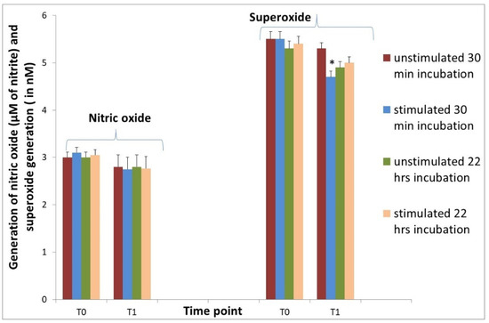 Superoxide generation under the influence of ANE was decreased at T1 after 30 min in comparison with values without stimulation. Changes in NO generation were insignificant (Figure 5).