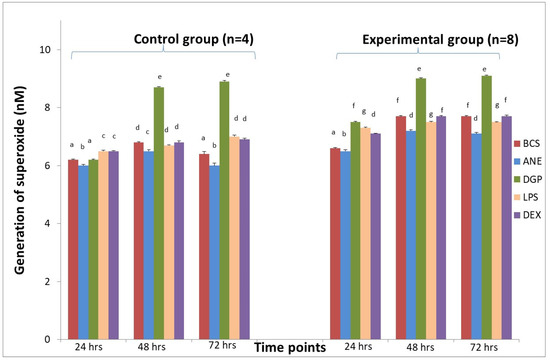 The effect of different stimulators on superoxide generation by macrophages derived from sheep in the control group (n = 4) and in the experimental group (n = 8) during insertion of Ti implant into the tibia. BCS—macrophages stimulated only with bovine calf serum, ANE—antimicrobial neutrophil extract, DGP—neutrophil degranulation product, LPS—lipopolysaccharide, DEX—dexamethasone. Values are mean ± SE obtained from each separate experiment conducted in both groups of sheep. There are significant differences between mean values marked with different letters (p < 0.05) compared to BCS group in each time point.