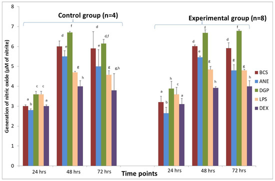 The effect of different stimulators on nitric oxide (NO) generation by macrophages derived from sheep in the control group (n = 4) and in the experimental group (n = 8) during insertion of Ti implant into the tibia. BCS—macrophages stimulated only with bovine calf serum, ANE—antimicrobial neutrophil extract, DGP—neutrophil degranulation product, LPS—lipopolysaccharide, DEX—dexamethasone. Values are mean ± SE obtained from each separate experiment conducted in both groups of sheep. There are significant differences between mean values marked with different letters (p < 0.05). compared to BCS group in each time point.