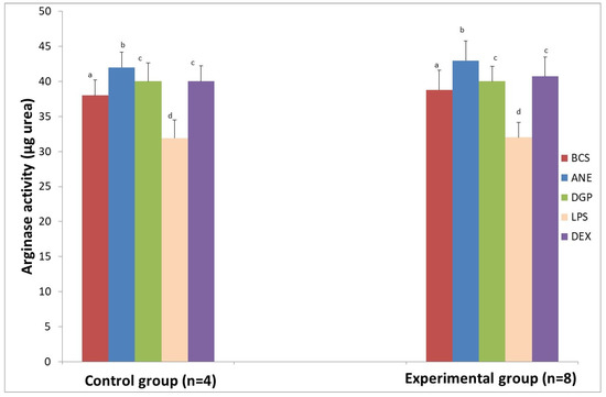 Together with a decrease of reactive oxygen and nitrogen species (RONS), an elevated arginase activity was noted after MDM stimulation with ANE. We found that arginase activity increased from 38.00 ± 2.2 μg urea to 42.00 ± 3.00 μg urea (p < 0.05) in the sheep from the control group, whereas in the experimental group it increased from 38.81 ± 2.63 μg urea to 42.98 ± 3.85 μg urea (p < 0.05) (Figure 8).