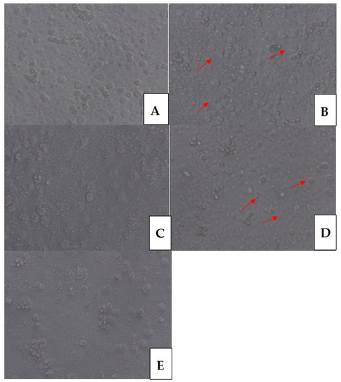 To assay hemolytic activity, freshly drawn ovine blood was collected into an EDTA tube and plasma was removed by centrifugation (500× g, 10 min). Erythrocytes were rinsed three times with PBS and resuspended at a concentration of 2%. Then, 200 μL of erythrocyte suspensions with various ANE concentrations (4, 40 and 100 μg/mL) were incubated at 37 °C for 30 min in 96-well microtiter plates. Triton X-100 (1%, Sigma-Aldrich Poznan, Poland) was used as the positive control for 100% hemolysis and PBS was used as the negative control. Absorption of supernatants was measured at 405 nm, using a BioTek EL800 microplate reader (BioTek, Janki, Poland). All assays were performed in triplicate [24,26,27].