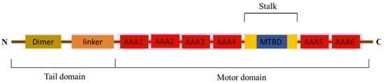 Cytoplasmic dynein is a multi-subunit motor complex with huge molecular weight, which performs a variety of cargo transport functions in cells. The DHC dimer is the core of cytoplasmic dynein. This is a multifunctional that is not only responsible for connecting the other components of other dynein complexes, such as intermediate chain (DIC) and regulatory proteins such as LIS1, but also binds to microtubules via the microtubule-binding domain (MTBD) and provides power for the negative movement of dynein complexes along microtubules by hydrolyzing ATP by six AAA ATPase domains. The other components of the dynein complex, such as the DIC and the light chain (DLC), are completed by the assembly of the dynein complex or combined with “goods” such as organelles and vesicles [23]. Moreover, DHC can change the function of dynein complex by binding with different components [24,25]. Therefore, studying DHC can help further elucidate the function of dynein.