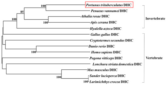The primary structure of Pt-DHC protein was predicted using online tools (http://www.bio-soft.net/sms/, accessed on 18 April 2021). The molecular weight and isoelectric point of Pt-DHC protein were predicted by ExPASy ProtParam tool (http://web.expasy.org/protparam/, accessed on 18 April 2021). DHC protein sequences of Homo sapiens (NP_001367.2), Mus musculus (NP_084514.2), Danio rerio (NP_001036210.1) and Drosophila melanogaster (NP_001261430.1) were downloaded from NCBI, and multiple sequence alignment was performed using Vector NTI 11.5 (Invitrogen). The phylogenetic tree of DHC protein amino acid sequences of different species was constructed using mega 5.1 software; the GenBank accession numbers of DHC homologues were Penaeus vannamei (XP_027209046.1), Athalia rosae (XP_012264199.1), Apis dorsata (XP_006622931.1), Hyalella Azteca (XP_018024055.1), Gallus gallus (XP_015143281.1), Cryptotermes secundus (XP_023724922.1), Pogona vitticeps (XP_020649242.1), Lonchura striata domestica (XP_021405311.1), Sander lucioperca (XP_031166063.2) and Larimichthys crocea (XP_027130998.1).