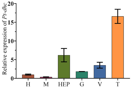 Expression level of Pt-dhc in different tissues. The Pt-dhc is widely expressed in different tissues in P. trituberculatus, with the highest expression in the testis. H: heart; M: muscle; Hep: hepatopancreas; G: gill; V: vas deferens; T: testis.