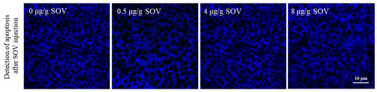 We used the TUNEL kit to explore whether apoptosis occurred in testis after SOV injection. The results showed that no obvious apoptosis signal (FITC, green fluorescence) was detected 48 h after the injection in 0, 0.5, 4 and 8 μg/g SOV concentration groups. The results showed that there was no apoptosis in the testis after injection of SOV (Figure 5).
