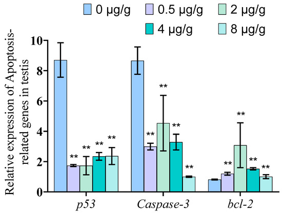To investigate whether the suppression of dynein via SOV injection would induce changes in the level of apoptosis of the testis, we measured the expression levels of apoptosis-related genes p53, Caspase-3 and bcl-2. The qPCR results showed that the expression levels of p53 and Caspase-3 genes decreased significantly (p < 0.01), and the expression level of the blc-2 gene increased significantly (p < 0.01) in P. trituberculatus testis after SOV injection (Figure 6).