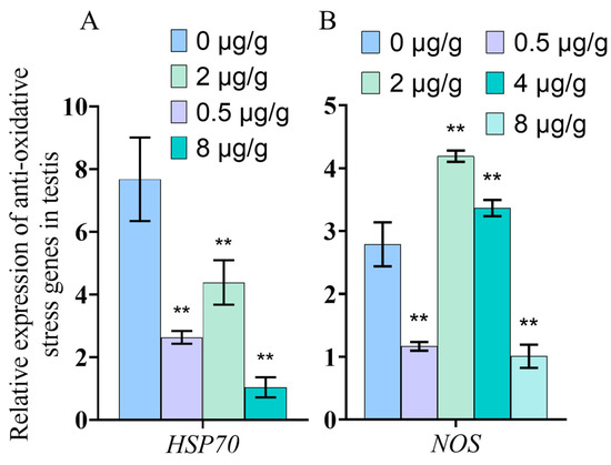 The qPCR results show that the expression of anti-oxidative stress genes HSP70 and NOS changed in tissues of P. trituberculatus after SOV injection (Figure 7). The results showed that the expression level of HSP70 decreased significantly (p < 0.01) in the testis tissue. The expression level of NOS gene decreased significantly at 0.5 μg/g (p < 0.01) and 8 μg/g (p < 0.01), but increased significantly at 2 μg/g (p < 0.01) and 4 μg/g (p < 0.01) (Figure 7).
