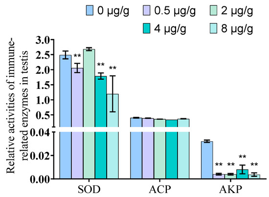 Enzyme activity detection of immunity-related factors. The enzyme activities of SOD and AKP in the testis decrease significantly, and ACP was no significant changed (** indicates significant compared with control group Significance. **: p < 0.01).