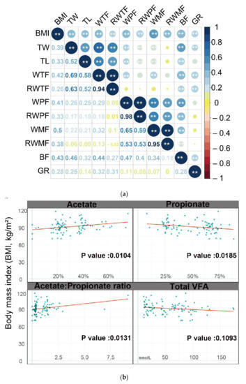 (a) Correlations between the analyzed phenotypic profiles of fat deposition in sheep. The size of the circle is proportional to the correlation. All traits were correlated to Body Mass Index (BMI) (0.26 < r < 0.50, 3.38 × 10−10 < p < 0.0019) and body fat thickness (0.18 < r < 0.47, 2.70 × 10−9 < p < 0.0375). ** p < 0.01. Body mass index (BMI); Tail width (TW); Tail length (TL); The weight of tail fat (WTF); The relative weight of tail fat (RWTF); The weight of perirenal fat (WPF); The relative weight of perirenal fat(RWPF); The weight of mesenteric fat (WMF); The realtive weight of mesenteric fat (RWMF); Thickness of backfat (BF); GR value (GR) (b) Linear regression fit was performed to determine relations between BMI and volatile fatty acids’ (VFAs’) data sets (for further details, see Table A2). Total VFA (mmol/L) = the sum of all individual volatile fatty acids. Single VFA (%) was expressed as relative amounts compared with total VFA concentration. Scatter plots with linear fit are shown and r and p values are listed; the red line shows the best-fit linear regression. To clearly compare the Shannon diversity (c) and Simpson diversity (d) (alpha-diversity) between the sheep with different levels of fat deposition, we generated boxplots to show the variation between the three groups (ns: p > 0.05, ** p < 0.01). (e) The PCoA plots showed no separation among these groups, which indicates BMI did not have a major effect on microbiota composition. These findings were supported by the results of the statistical analysis (Permutational Multivariate Analysis of Variance, PERMANOVA; F = 1.32; R2 = 0.02; p < 0.05).