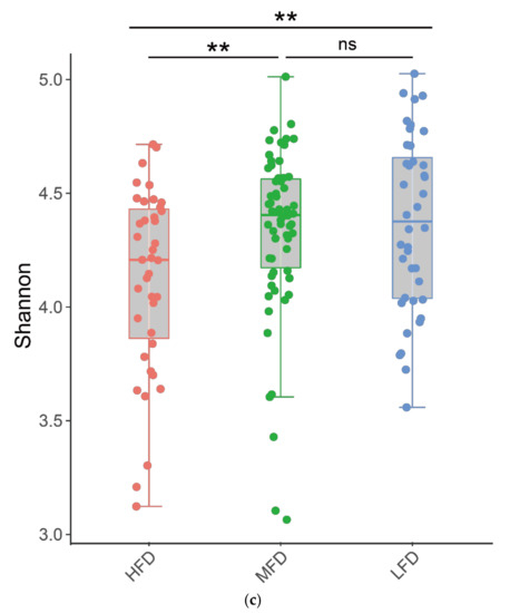 In accordance with Mantel test results, the effect of ADFI on microbial population did not reach the significance threshold (Mantel r = −0.009759, p = 0.6012). For this reason, the following analysis does not further consider the animal intake. We then explored the community structures of the rumen microbiotas among the FD groups using alpha and beta diversity metrics. The Simpson index was not significantly different (ANOVA test, p = 0.09; Figure 1d); however, the Shannon index showed differences between the groups (ANOVA test, p = 0.008; Figure 1c). Significant differences were found for subsequent multiple comparisons using the least significant difference (LSD) test; the Shannon and Simpson indexes were significantly higher in the LFD group than in the HFD group. The Firmicutes/Bacteroidetes ratio is an important parameter to evaluate the distribution of the gut flora; however, there was no significant differences in the Firmicutes/Bacteroidetes ratio in the present study (LFD = 1.36, MFD = 1.13, HFD = 1.03; p > 0.05). The results of PCoA analyses based on OTU levels were displayed as scatter plots (Figure 1e), and no significant regional differences were evident, which indicates BMI did not have a major effect on microbiota composition. The statistical analysis supported these results (PERMANOVA; F = 1.32; R2 = 0.02; p < 0.05).