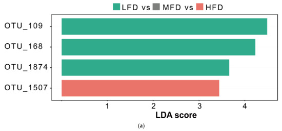 LEfSe analysis was performed to identify the differentially abundant bacteria composition (Figure 2a; LDA> 3, FDR< 0.05). In the LFD group, Prevotellaceae of the Bacteroidetes (two OTUs: 109, 168) and Lachnospiraceae (OTU_1874) of the Firmicutes were identified as important microbial biomarkers. Only unidentified_Ruminococcaceae (OTU_1507) of the Firmicutes was enriched in the HFD group.