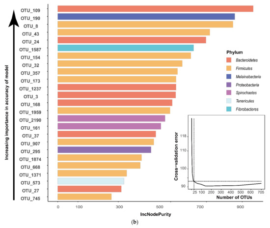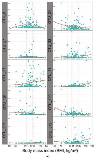 To avoid the bias introduced by categorization, the RF machine learning algorithm was used to regress the relative abundance of rumen bacteria against the BMI of the sheep, to establish a model that correlated the fat deposition level with the rumen microbiota composition. The model explained 15.5% of the variance in the rumen microbiota related to the fat deposition level in the sheep. Additionally, the Mantel test revealed that bacterial communities and fat deposition had a weak but significant positive correlation (n = 141, mantel test: r = 0.10, p = 0.004). To verify the relevance of bacterial communities to phenotype, some randomly selected samples (close to normal distributions) were tested, and this relationship proved, once again, significant (see Table A4). To determine which rumen bacterial taxa were the primary drivers of fat deposition in sheep, five repeats of 10-fold cross-validation were performed to evaluate the important bacteria. When we used 25 OTUs, the number of classes against the cross-validation error curve stabilized; therefore, these 25 OTUs were defined as biomarkers in the model (Figure 2b). The taxonomic profiles of the detected 25 biomarker OTUs are summarized in Table A3. Among the results, three OTUs were assigned to Prevotellaceae and three to Lachnospiraceae. At the genus level, we detected Oribacterium and Succinivibrio. In addition, eight bacteria species (in 29 biomarkers, see Table A3) were associated with sheep BMI. In these two approaches, three overlapping markers were identified. Subsequently, locally weighted regression curve fitting was applied to visualize the trends between biomarkers and BMI. In this analysis, only the microbial taxa from the non-overlap results and above the genus level were shown.